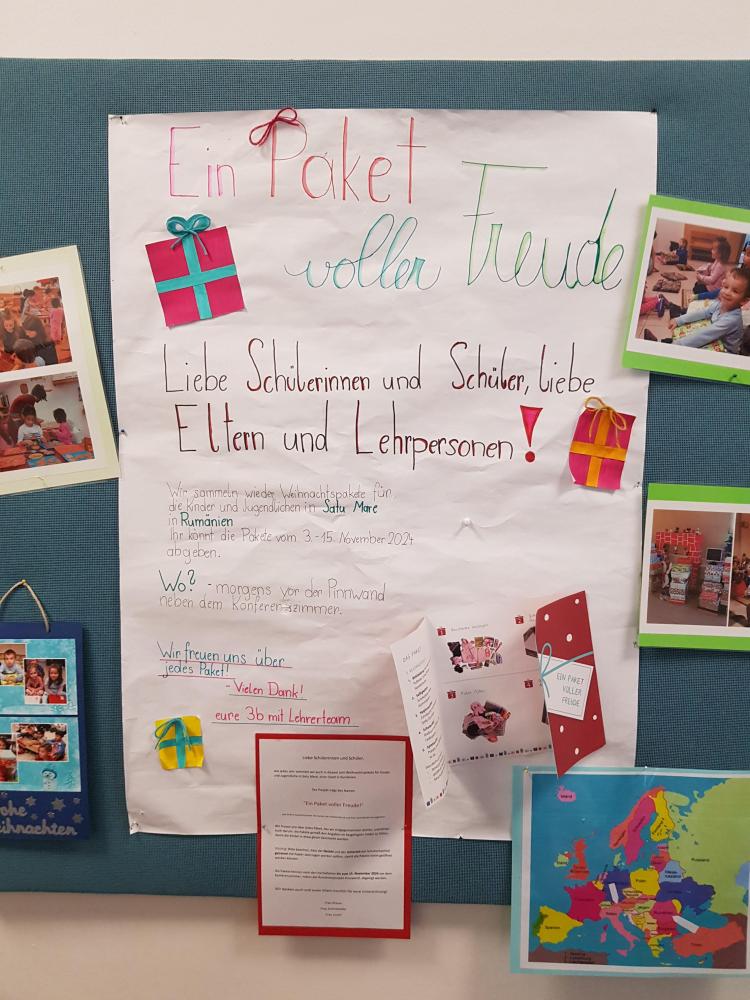 Dieses Jahr hat sich die 3b im Religionsunterricht näher mit dem Rumänienprojekt „Ein Paket voller Freude“ beschäftigt und zahlreiche Plakate gestaltet, um in der Schule dafür zu werben.
