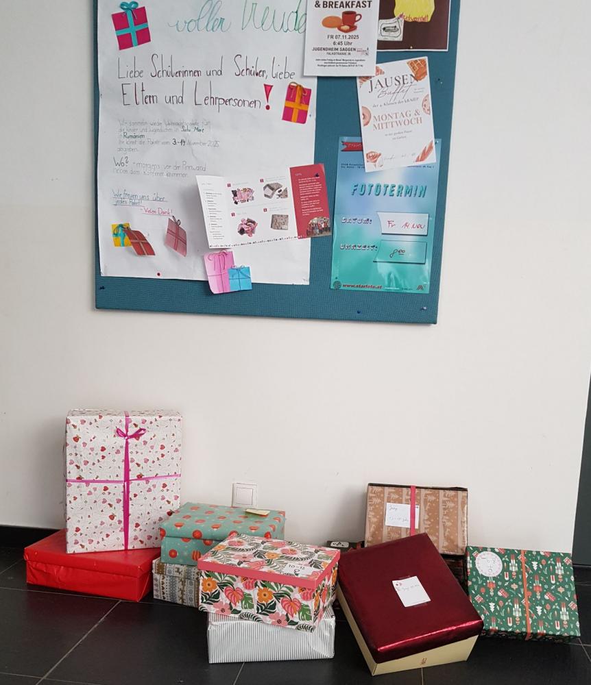 Schon seit vielen Jahren sammeln wir von Ende Oktober bis Mitte November Weihnachtspakete unter dem Motto „Ein Paket voller Freude“ für bedürftige Kinder in Rumänien. So auch heuer wieder! Es war eine Freude zu beobachten, wie der „Berg der Pakete“ vor dem Konferenzzimmer unserer Schule jeden Morgen anstieg.